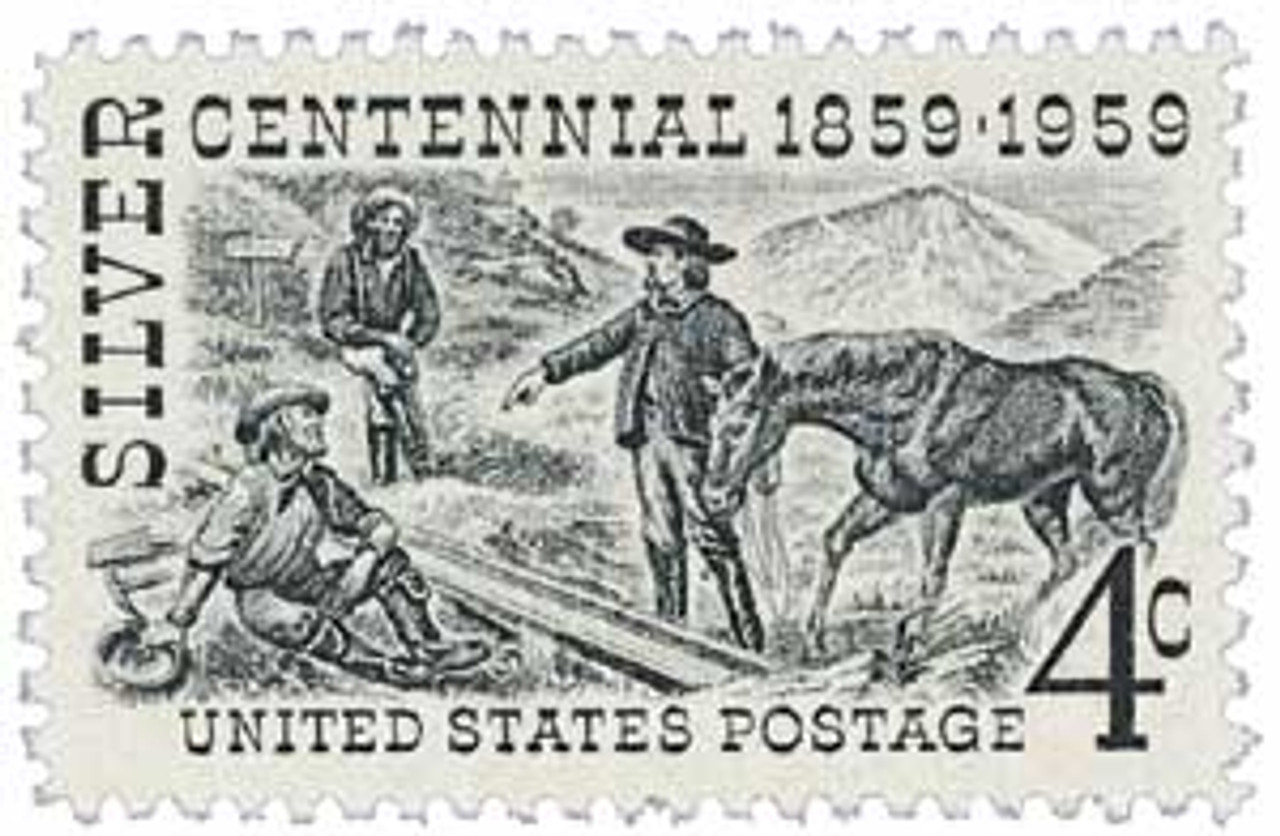In 1959, this stamp was issued to commemorate the 100th anniversary of the Comstock Lode in Nevada. Lured by the discovery of gold and silver, miners erected tent cities that eventually turned into some of the most important cities in the U.S. today.