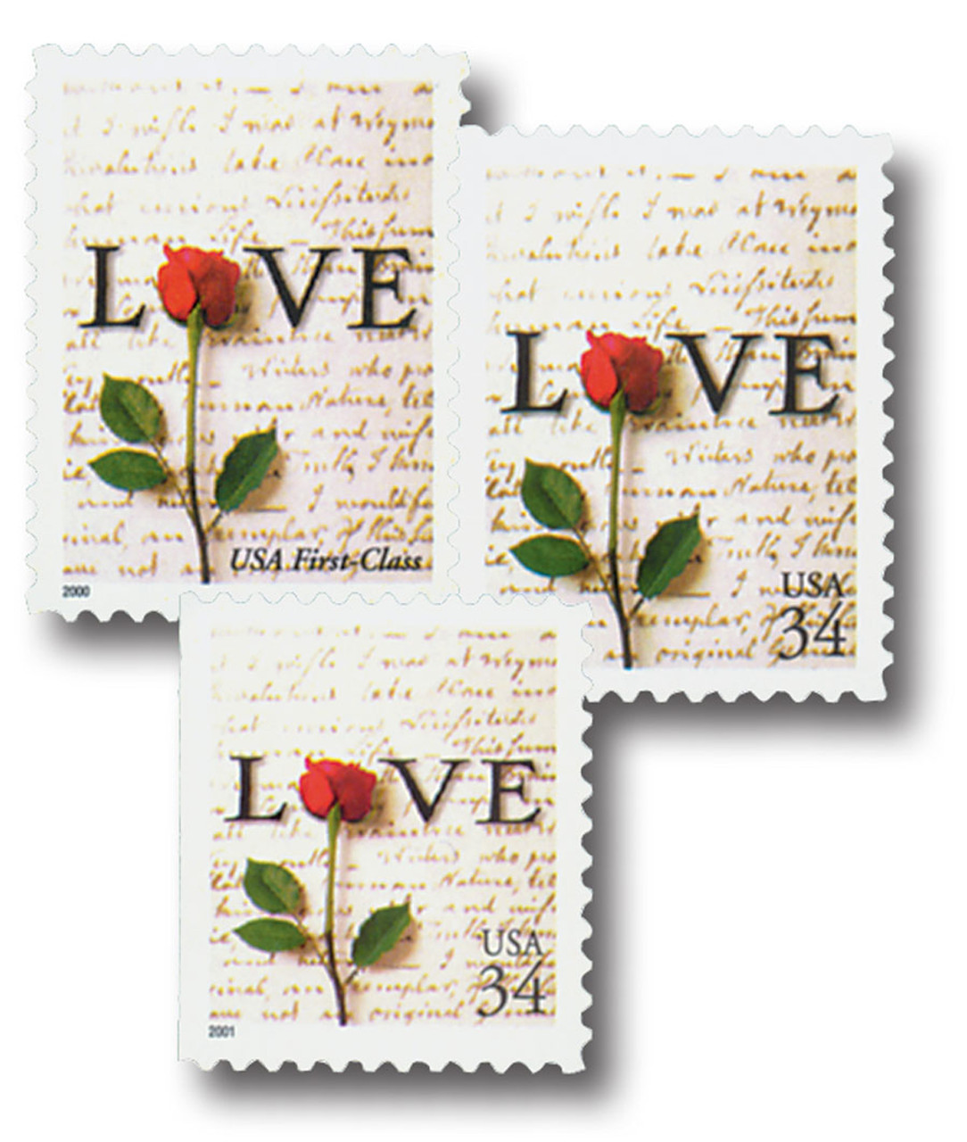 Long a symbol of devotion, a red rose lies across a handwritten love letter on this 2001 Love stamp. The letter on the non-denominated and on the 34¢ stamp is from John Adams to Abigail Smith, before their marriage and before he became the second President of the U.S. The 55¢ stamp has a similar design, but uses a letter from Abigail to John.