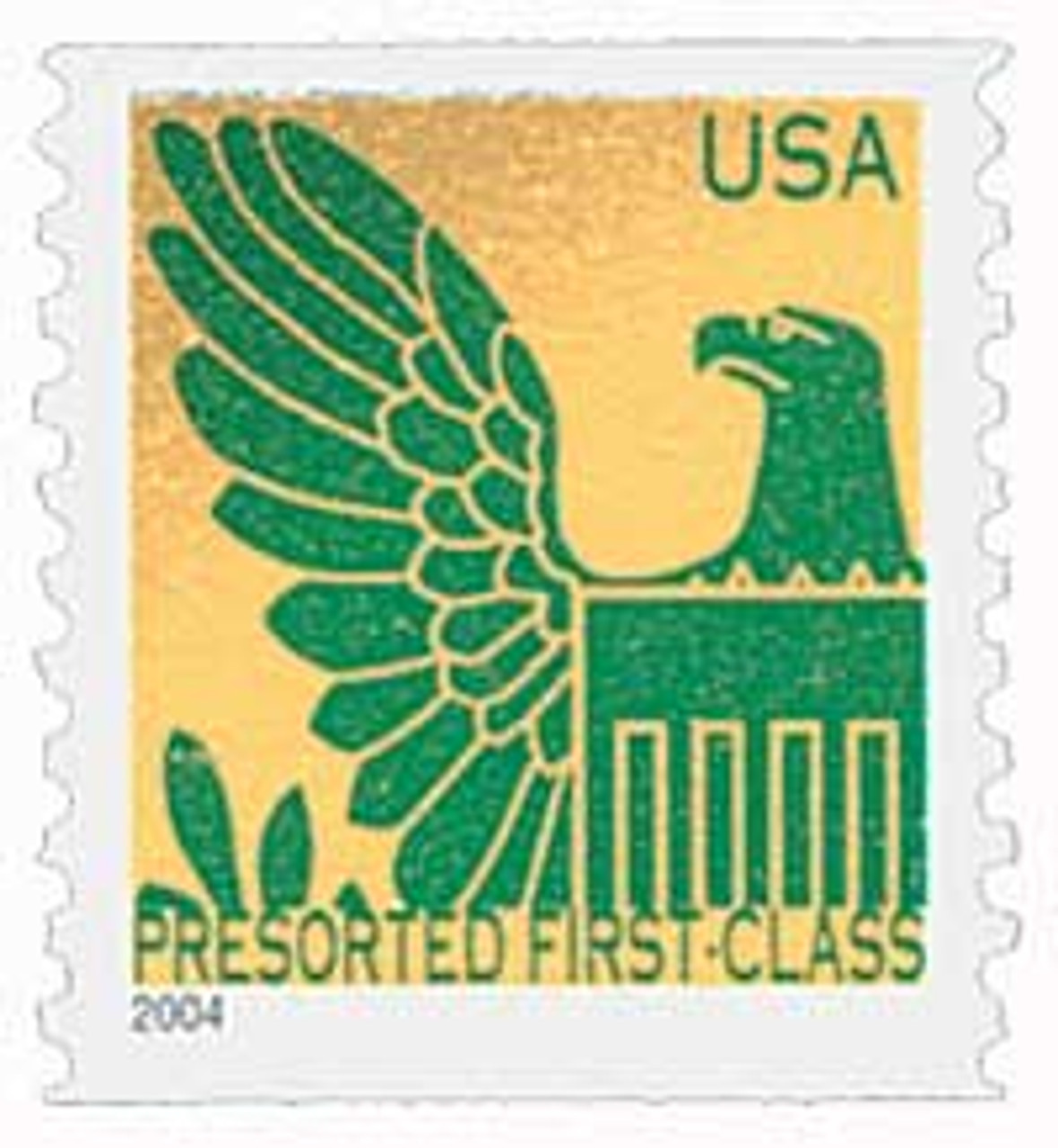 This coil design paid the presorted first-class rate. The design features a detail of the Great Seal of the United States and was offered in ten two-color combinations. Previously issued in 2003 as a self-adhesive coil, the ten American Eagle coil designs reappeared in 2004 with water-activated gum.