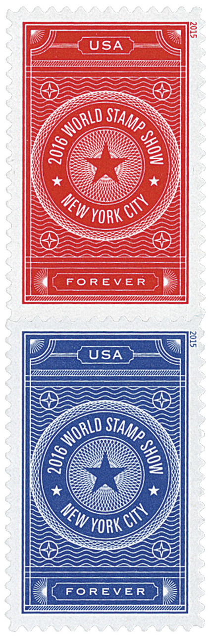 Michael Dyer and art director Antonio Alcalá designed the 2016 World Stamp Show stamps. The intricate pattern on these stamps is meant to resemble classic 19th-century engraved stamps and banknotes. The top of the mint sheet reads “Join us for a Wonderful Week at World Stamp Show – NY 2016,” while the text on the back of the sheet has details about the show.