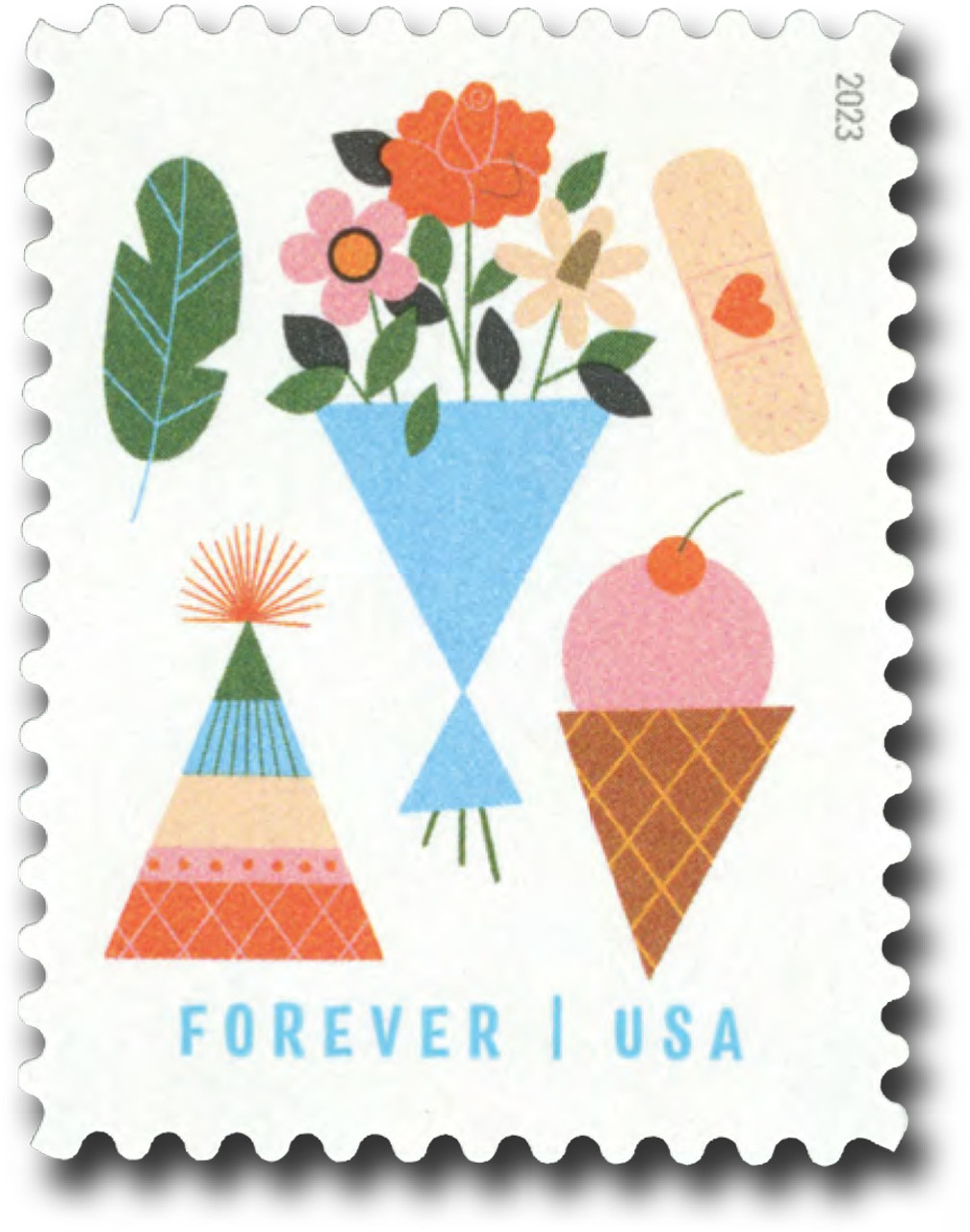 About the stamp design: Pictures digital illustrations with a bright, cheery color palette. Images include a leaf, bouquet, bandage, hat, and ice cream cone.