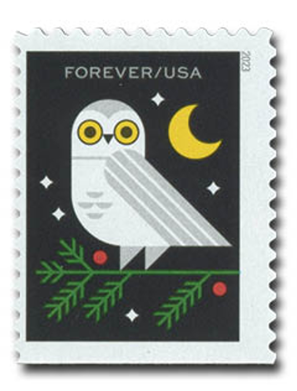 About the stamp design: Pictures an owl in a wintery habitat where the species might be found in the wild. Art by Katie Kirk.
