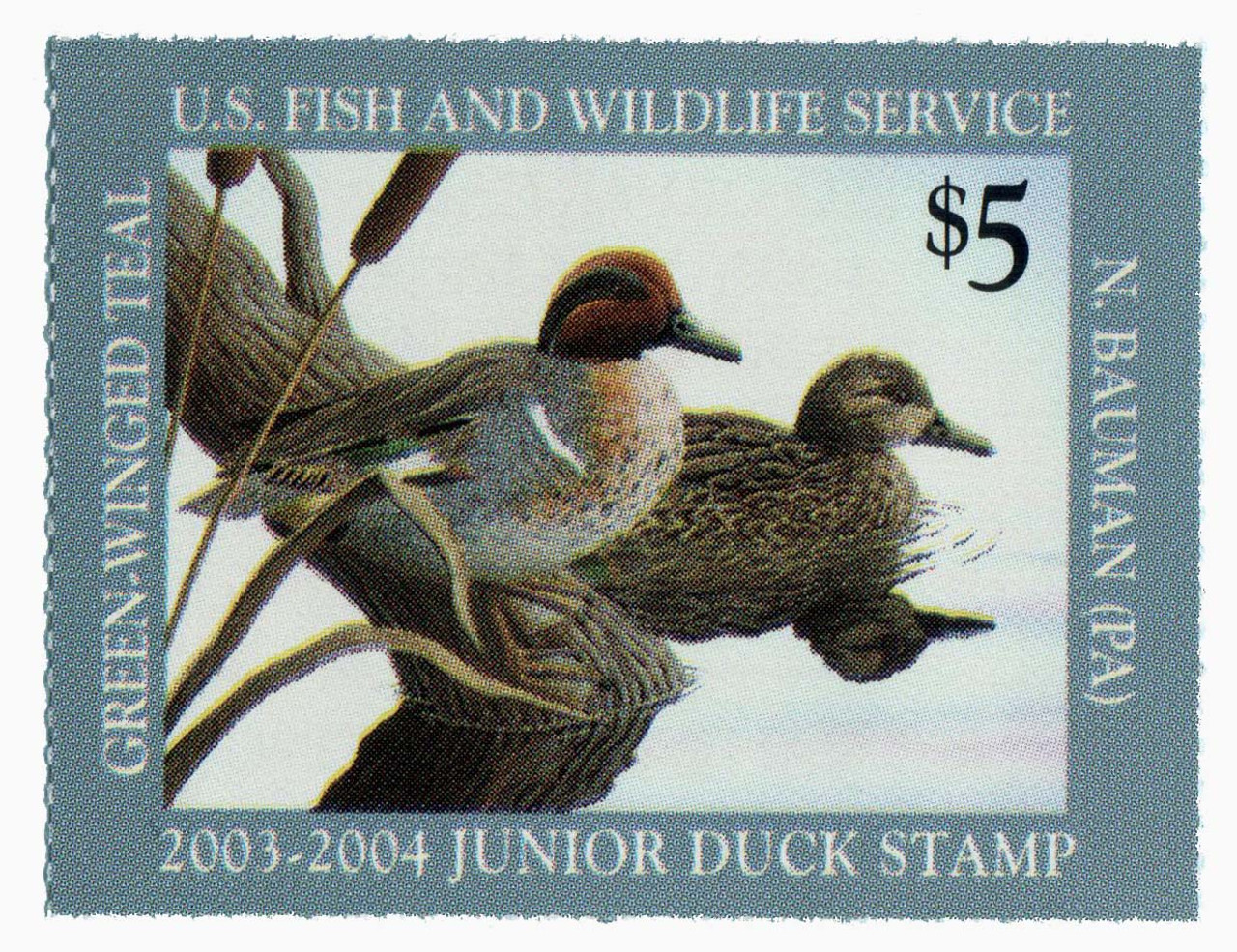 The 2003-04 Junior Duck Stamp winner was 17-year-old Nathan Bauman from Jonestown, Pennsylvania, with a painting of a pair of Green-winged teal. The stamp includes the artist’s name and home state on the right border of the central design. Order it today.