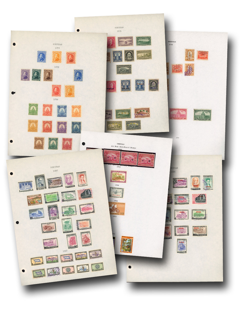 760+ mint and used Honduras stamps, 1866-1997. On homemade album pages. Estimated Scott catalog value $803.